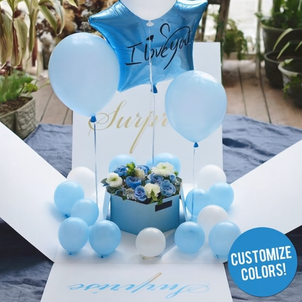 Give your loved one a magical gift experience they won't forget! Surprise them with this wonderful gift box, that opens to a flower arrangement that's been carefully put together with celebratory balloons that float when the box is opened.