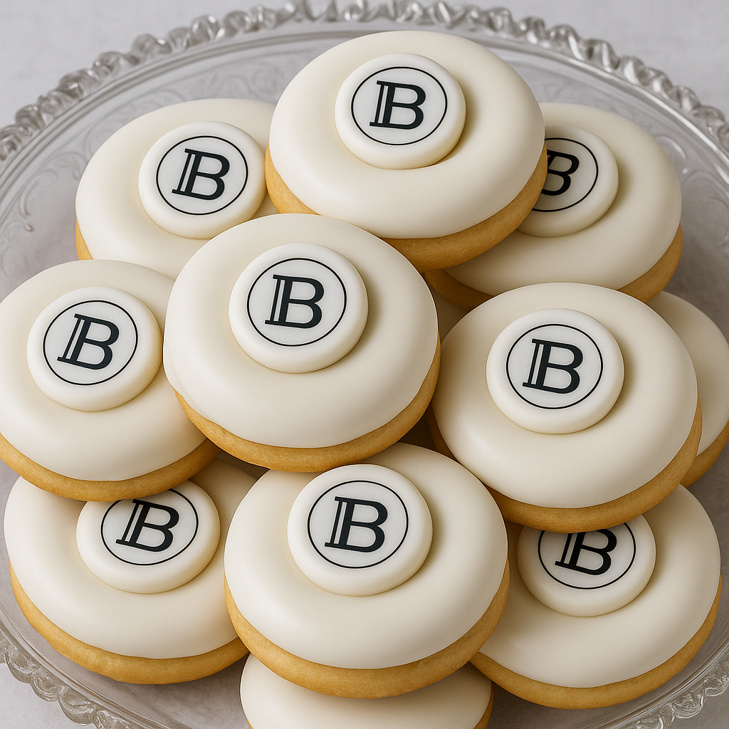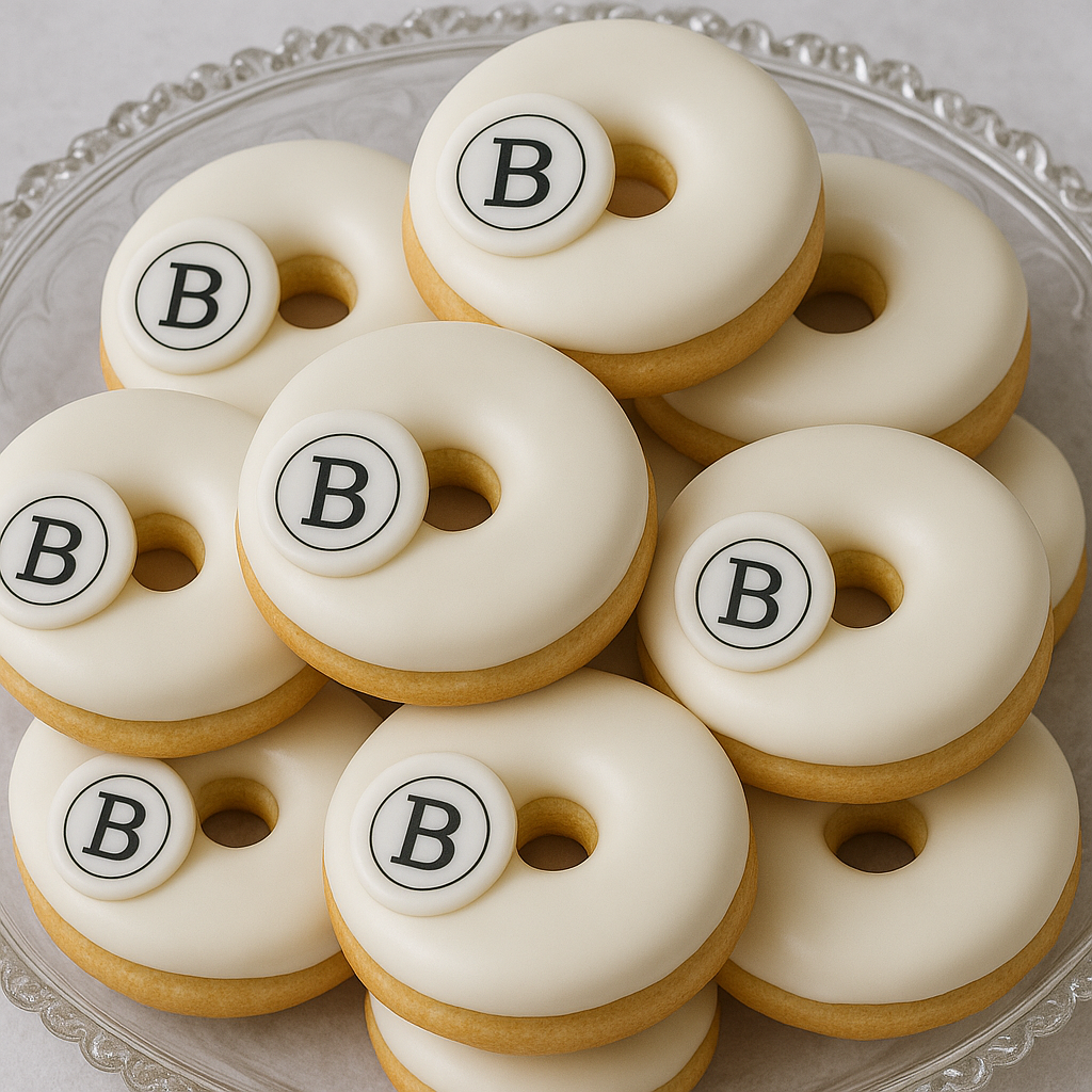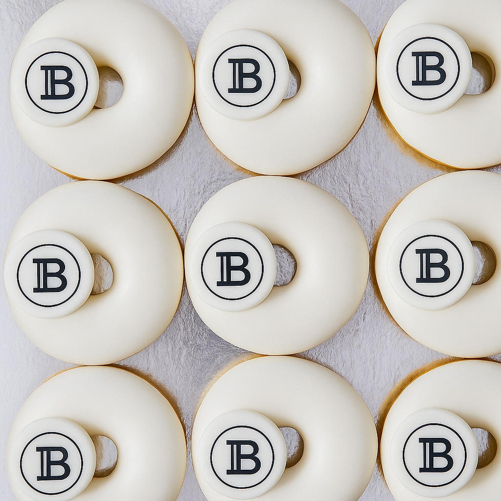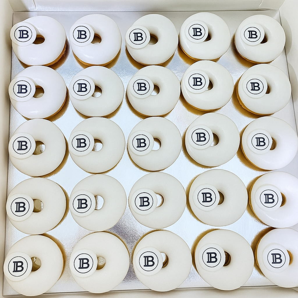 Create your own customised baked donuts! Baked fresh and coated with royal icing & your logo on fondat. Upload a company or corporate logo and use the options below to select no of pieces, flavors and more!