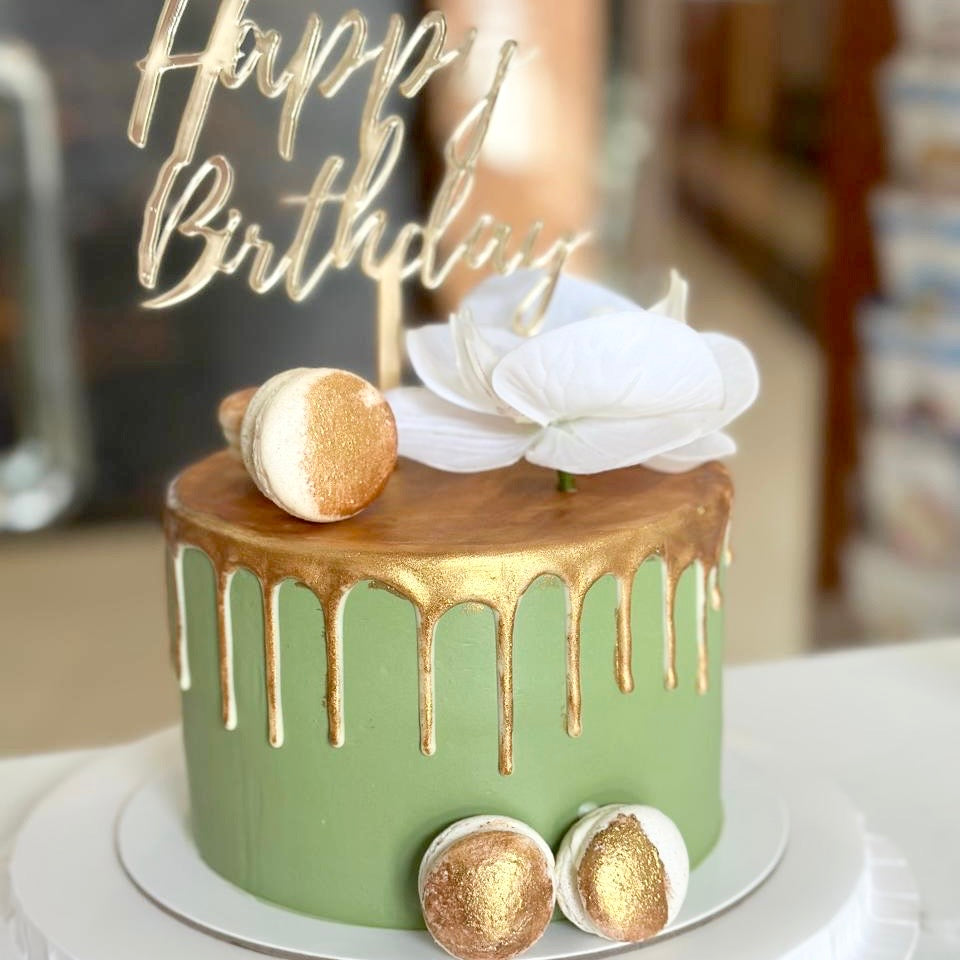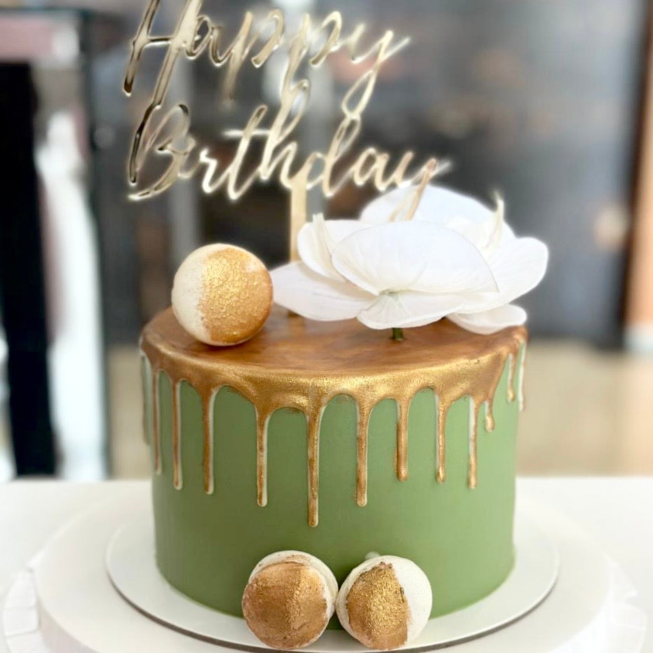 An Elegant olive green & gold cake topped with macarons & orchid! Perfect gift for her, your wife, girlfriend, mother, friend or any recipient! Perfect for Birthday or any special occasion!