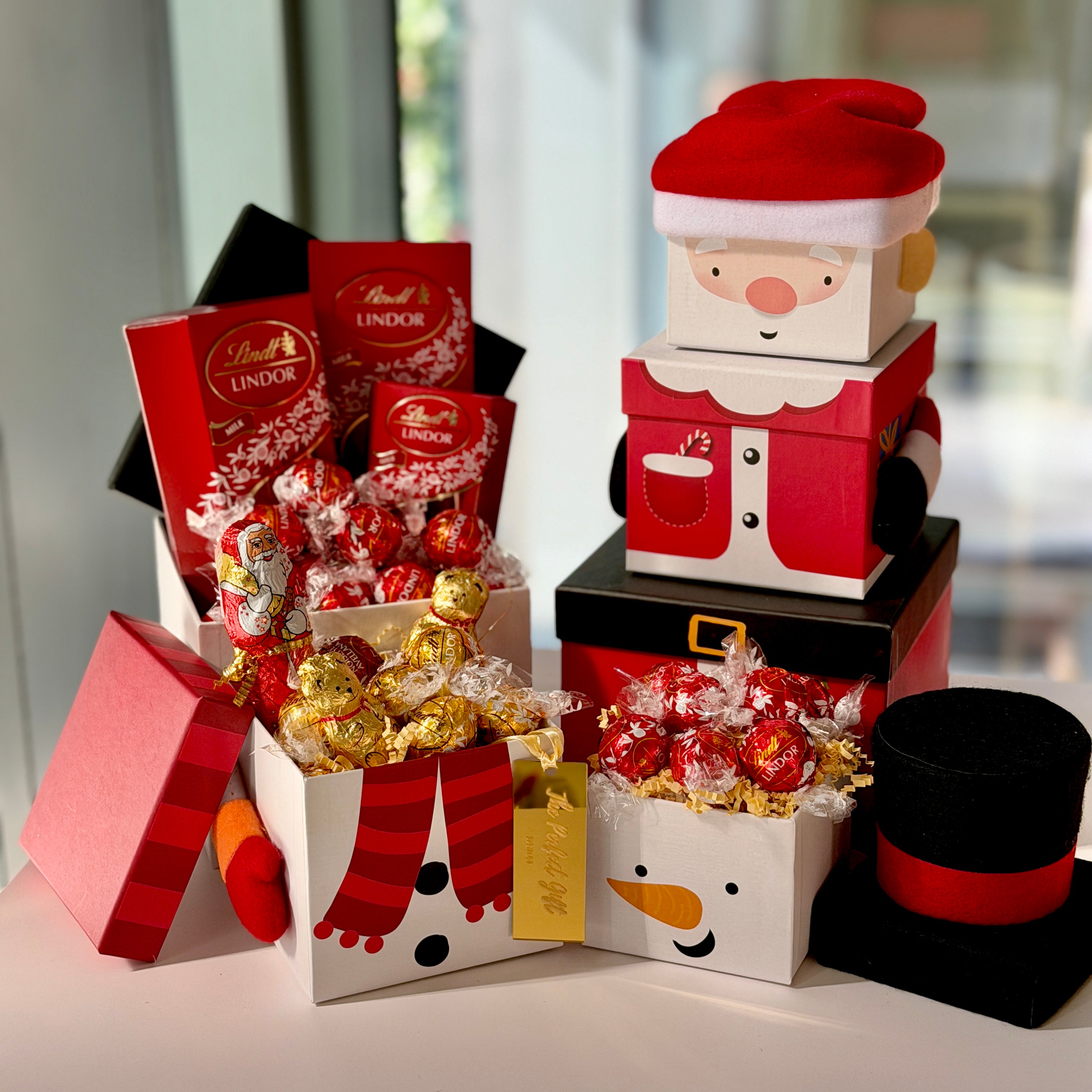 Send your warmest wishes and surprise loved ones this festive season with this beautiful Christmas themed gift box tower filled with Lindt Festive chocolates! Christmas hamper box includes:
