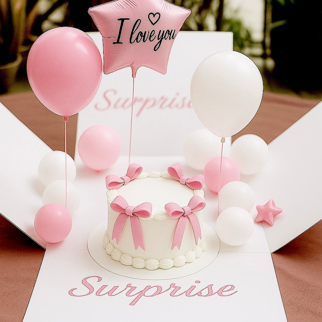 Give your loved one a magical gift experience they won't forget! Surprise them with this wonderful gift box, that opens to a birthday cake for 5-6 persons that's been carefully put together with celebratory balloons that float when the box is opened.