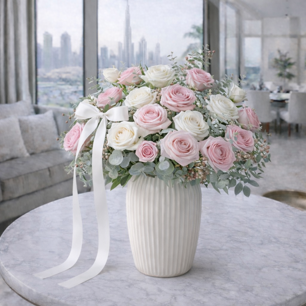 White & Pink Roses in Luxury White Vase